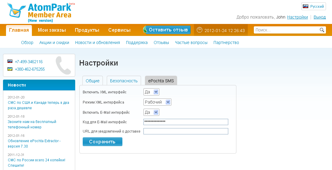 - Регистрация в сервисе ePochtaSMS и настройка аккаунта