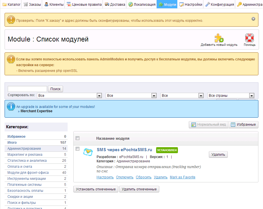 Модуль ePochta SMS для Prestashop версии 1.5.x.
