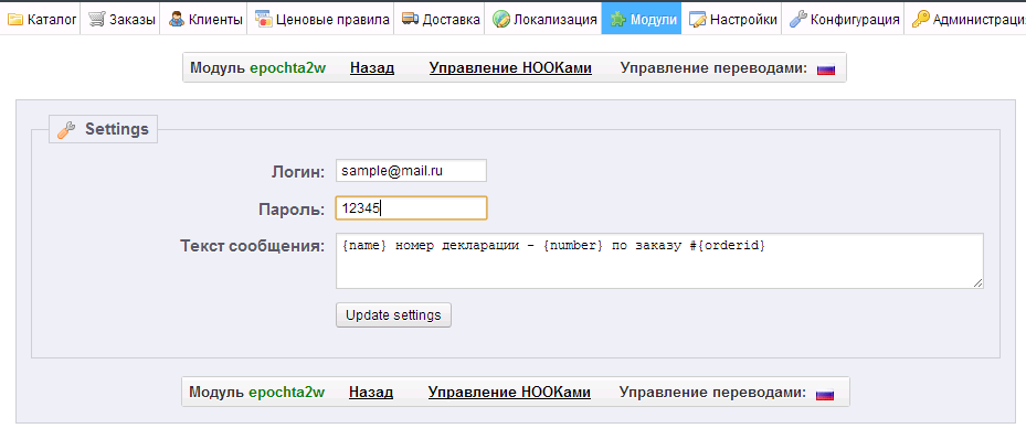 В настройках введите и сохраните логин и пароль вашего аккаунта сервиса ePochta SMS.