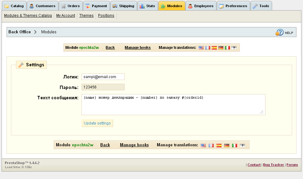 Скачайте файл модуля ePochta SMS и сохраните в любой папке на вашем компьютере. Закачайте zip-файл в Prestashop по стандартной процедуре установки модулей. Активируйте модуль и перейдите к настройкам.