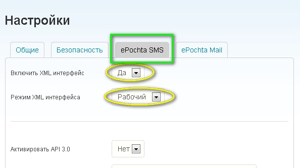 - Зарегистрируйтесь в сервисе ePochta SMS, зайдите в его настройки и внесите данные, как показано на скриншоте