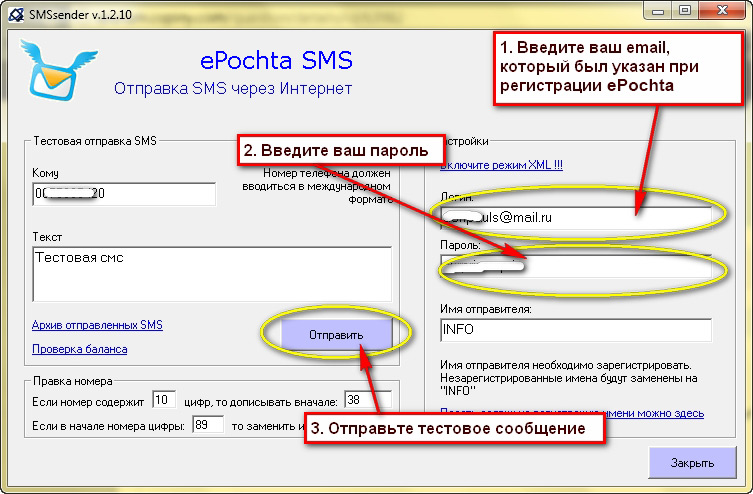 - Введите свои данные, которые использовали при регистрации в ePochta SMS, номер телефона получателя и текст сообщения. Нажмите кнопку "отправить" для отправки тестового сообщения.