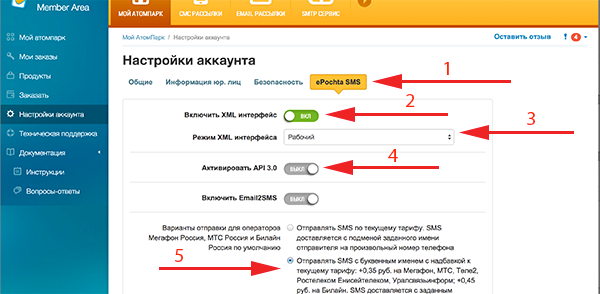 1. Перейдите в личный кабинет ePochta SMS и перейдите в раздел настроек. Там выберите значения в форме так, как указано на картинке ниже
