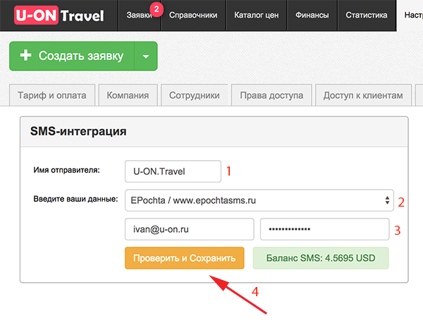 3. Укажите свой логин и пароль к ePochta SMS в U-ON.Travel