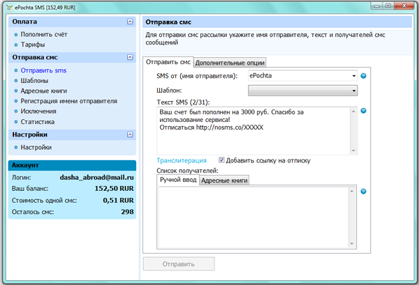Для начала работы с программой необходимо зарегистрироваться в сервисе ePochta SMS. При отправке смс через программу, вся статистика и история осуществленных рассылок доступна в личном кабинете сервиса.